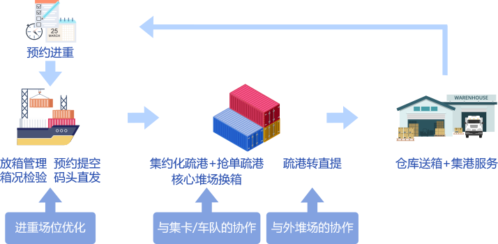 空箱业务流程再造,打通港口预约及箱动态数据,协同堆场、港口信息平台及运输车队,实现集装箱灵活调配,高效运转